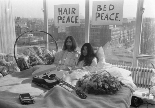 В 1969 Джон Леннон, лидер группы The Beatles, перевернувшей весь мир, и художница-японка Йоко Оно сделали из своего медового месяца хеппенинг: на неделю они закрылись в номере отеля Хилтон в Амстердаме и превратили в медийную реальность лозунг Make Love, Not War. Неделя в постели - это был их вклад в дело борьбы за мир.