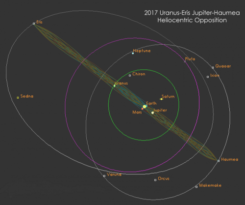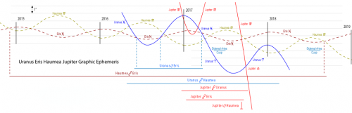 Термин «карликовая планета» появился в 2006 г. в рамках новой классификации тел Солнечной системы. Объекты, достаточно массивные для того, чтобы «расчистить» окрестности своей орбиты, попали в категорию «планет»: объекты, не способные достичь гидростатического равновесия, были определены как «малые тела» или «астероиды». Карликовые планеты заняли промежуточное положение между этими категориями. На данный момент MAC официально признал пять карликовых планет: Цереру, Плутон, Эриду, Хаумеа, Макемаке (из этого списка только Плутон был «понижен в звании», а остальные, наоборот, «пошли на повышение», перестав быть просто одним из астероидов). Однако не исключено, что как минимум 40 уже известных объектов Солнечной системы принадлежат к этой категории. По крайней мере, еще один крупный объект в поясе астероидов Паллада - может быть классифицирован как карликовая планета, если окажется, что ее форма определяется гидростатическим равновесием (пока что это убедительно не доказано). По оценкам ученых, до 200 карликовых планет может быть открыто в поясе Койпера и до двух тысяч - за его пределами. Тем самым астрономы поставили в очень неудобное положение астрологию. Планет общепризнаных теперь стало восемь! А в классификации небесных тел появился "средний класс", да еще какой перспективный по своим обьемам. Но астрологи, как истинные уранисты начали с увлечение изучать новые переменные и добавлять их в свой анализ. Хотя справедливости ради, некоторые астрологи давно уже к ним присматривались и успешно применяли на практике. Взглянув только на угол наклона и эксцентриситет орбиты и при этом внушительные сроки сидерический период, сразу понятно, что карликовые планеты не так просты, и научиться применять их в астрологии потребуется много времени. В данном исследовании нас интересуют две карликовые планеты Эрида и Хаумеа. Эрида (E r i z) · олицетворение раздора и соперничества, одна из первичных мировых космогонических сил, она дочь Никты и внучка Хаоса. Отсюда и двойственная сущность Эриды: с одной стороны, она породила голод, скорби, битвы, убийства, споры, тяжбы и беззаконие, с другой, она же породила труд. Отсюда у Гесиода две Эриды: одна вызывает войну и вражду и нелюбима людьми, другая - полезна людям, заставляя их состязаться в труде. Эту Эриду, согласно легендам, Зевс поместил между корнями земли, что символизировало ее подчинение и предназначение служить людям. Эрида также известна в связи с "яблоком раздора", когда на свадьбе Фетиды и Пелея она подкинула трем богиням - Афродите, Афине и Гере - яблоко с надписью "Прекраснейшей", что послужило причиной их губительного соперничества и, впоследствии, Троянской войны, так как каждая думала, что прекраснейшая - это она. Хаумеа (Haumea) — гавайская богиня плодородия родом из Нуумеалани, священной страны богов. Сестра Кане и Каналоа; в других мифах — жена бога Кане. Имела большое потомство: была матерью богини вулканов Пеле, бога войны Кекауакахи, богини-покровительницы острова Гавайи и танца хула Хииака. Согласно другим легендам, Хаумеа отождествлялась с богиней Папа, жены Вакеа, который считался прародителем гавайской аристократии — алии. Вместе они почитались как прародители всех гавайцев. Считалась одним из самых почитаемых божеств Гавайских островов. Давайте теперь взглянем на эфемериды Эрида, Х